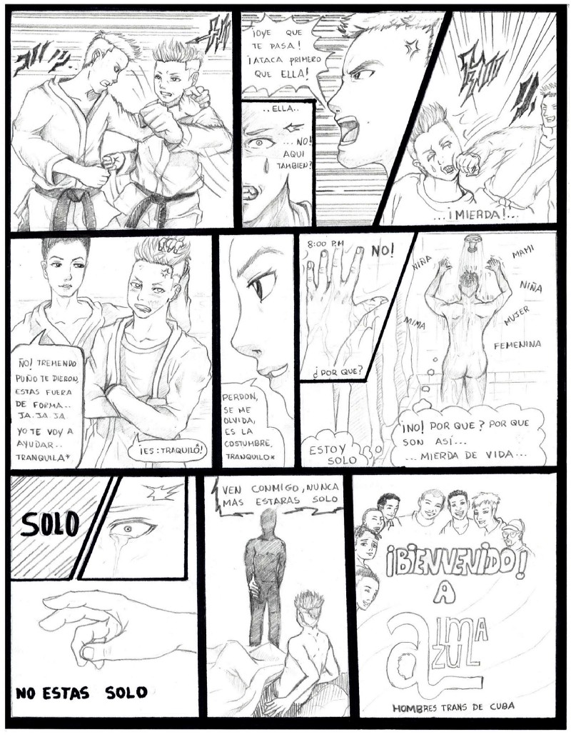 Según Justin, para dibujar se inspira en su propia realidad y, en el caso de la historieta que publicamos hoy, en el impacto que ha tenido para él encontrar un espacio de apoyo como Alma Azul, la primera red de personas trans masculinas en Cuba.