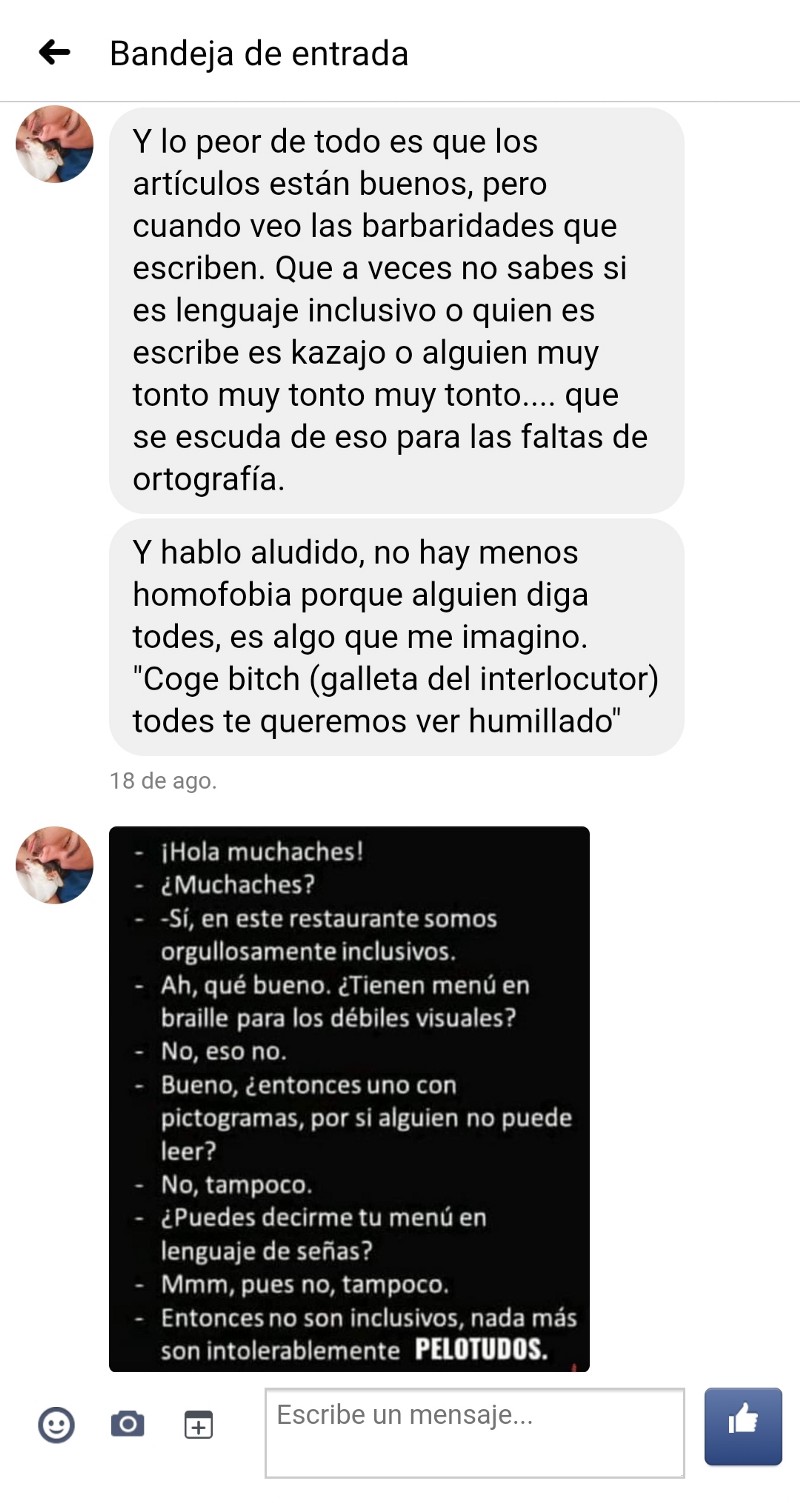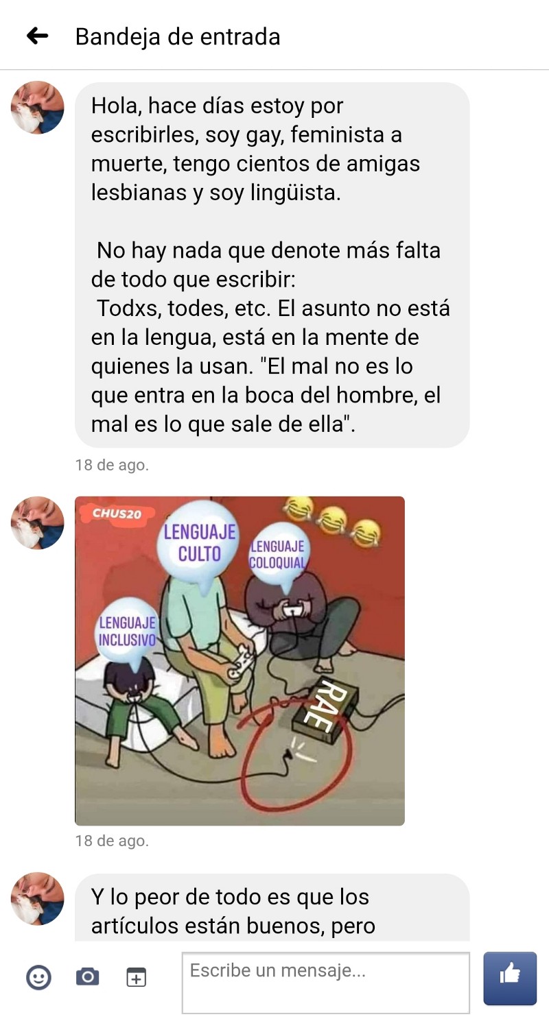 Han escrito a nuestra página de Facebook para insultarnos, para darnos clases de lingüística y gramática, han comentado en perfiles de quienes comparten nuestros artículos increpando el uso de la “e” y la “x” en los textos. Incluso en intercambios con personas del ámbito de la comunicación, a la vez que opinan que hay demasiados temas urgentes que atender como para dedicarle espacio al lenguaje inclusivo neutro, han terminado centrando el debate precisamente en ese tema.