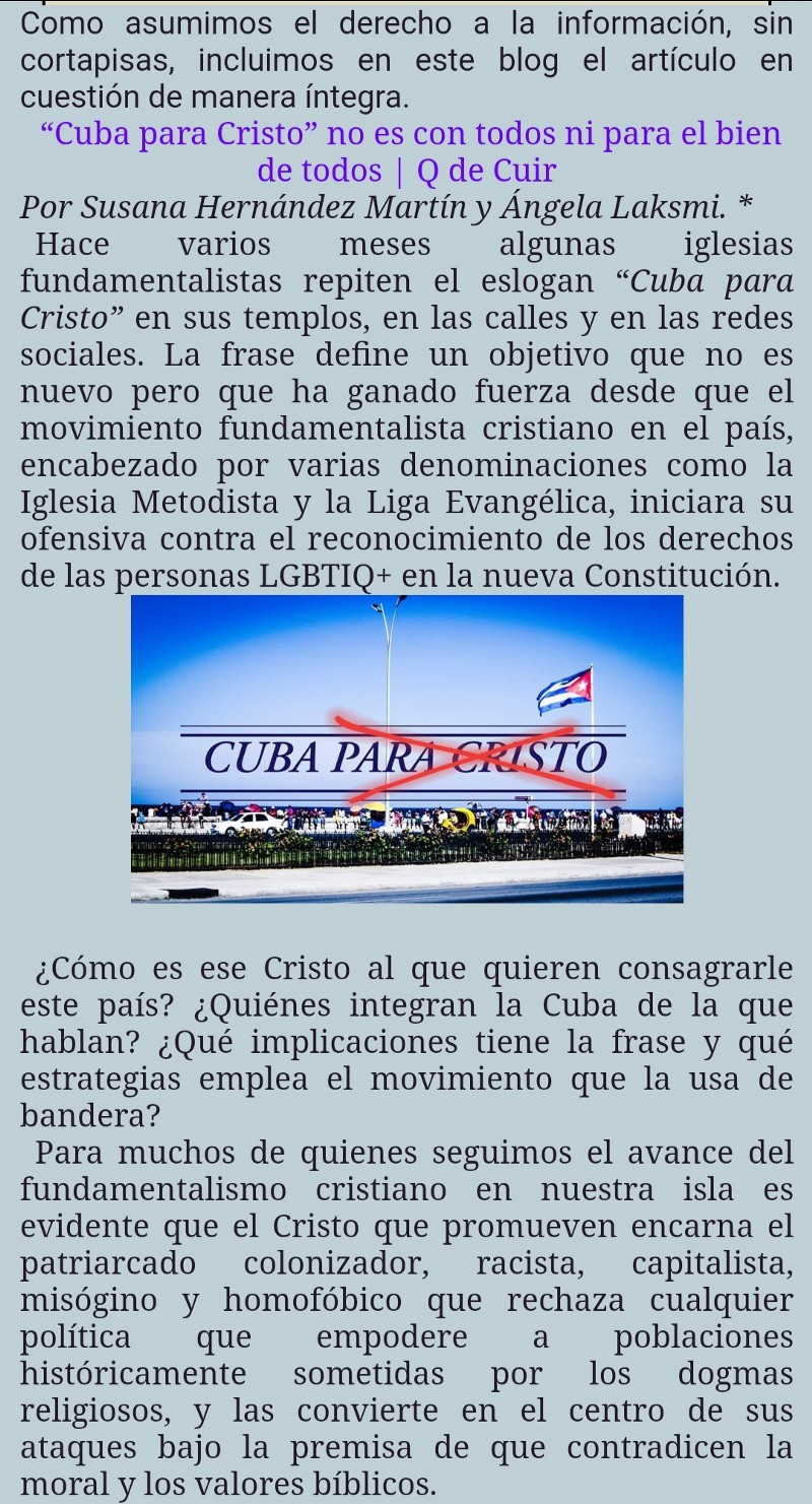 El blog Religión en Revolución compartió el artículo Cuba para Cristo no es con todes ni para el bien de todes y cercenó no solo el título, sino el cuerpo del texto, donde eliminó todos los recursos de lenguaje inclusivo neutro que encontró a su paso.