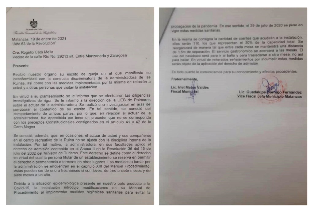 En la respuesta de la Sucursal Palmares de Matanzas, firmada por su directora Rosa María García Fuentes, explican que durante la investigación no se pudo comprobar que existieran violaciones por parte de la administradora de Las Ruinas y aseguran que “la comisión reconoce el Derecho de Admisión que le asiste a la Administradora de la instalación para sancionar y prohibir la entrada de clientes que manifiestan conductas inapropiadas que dañen o denigren la imagen de la instalación”.