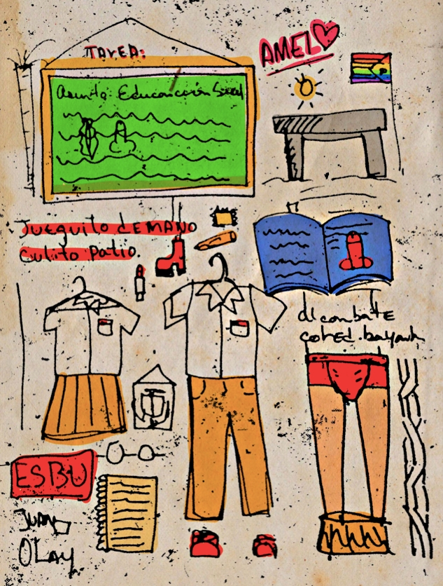 A la hora del receso no teníamos ganas de hablar de cuán cansados y confundidos estábamos. Los varones de mi aula se reunían más bien a criticar al muchacho del grado superior, que realmente era una muchacha. A ella no la dejaban ir en saya a la escuela y todos reímos cuando decidió aparecerse así un buen día. Yo reí con tal de pertenecer al grupo pero realmente sentía envidia por su desprendimiento, por su valor de mostrarse tal y como realmente era. Su expulsión no generó comentarios, más bien alivio entre los profesores, que estaban tan preocupados por eso como de que los niños no lleváramos prendas con la bandera de Estados Unidos. El receso siempre fue el mismo. Una burla constante a lo diferente. Tal vez lo aprendimos de nuestros profesores. En mi aula estaban las personas más desgraciadas, los que maltrataban a los demás. Sus comportamientos no se limitaban al recreo; dentro del aula se sentía una atmósfera de testosterona y hostilidad que se vertía en turnos de clases saboteados, lo que trajo como consecuencia un aprendizaje intermitente. Ver cómo los varones se pasaban todas las tardes restregándose los unos con los otros, rompiéndose los brazos, ensuciándose las camisas, amenazándose, insultándose, provocándose y probándose fuerzas como si de rituales de honor se trataran, me hizo dudar en algún momento de mi quietud en los bancos, leyendo y hablando de cualquier tontería. Me dejé influenciar en otros aspectos. La violencia nunca fue para mí una vía de expresión.